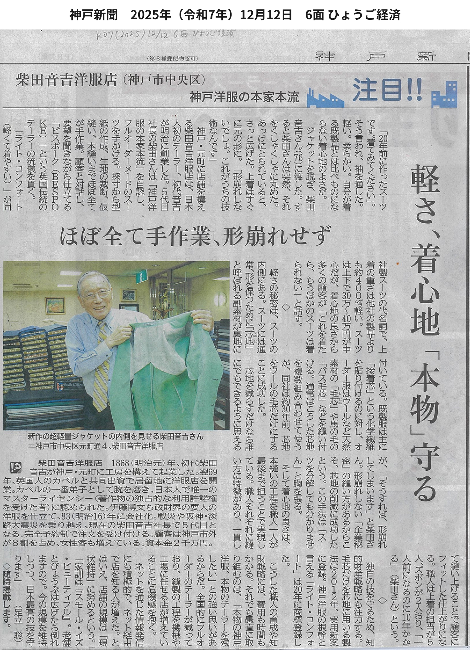「神戸洋服の本家本流 柴田音吉洋服店」(神戸新聞)